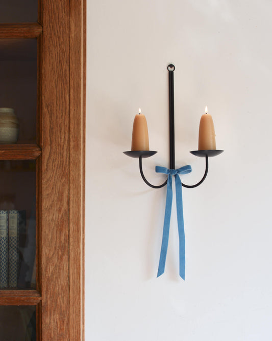 Ceramic candle holders, hand-thrown in Norfolk by Eleanor Torbati. Metal wall sconces, made in Yorkshire. Iron candlesticks, hand-forged in India. Perfectly suited to our hand-dipped beeswax candles.
