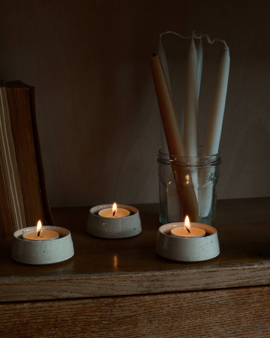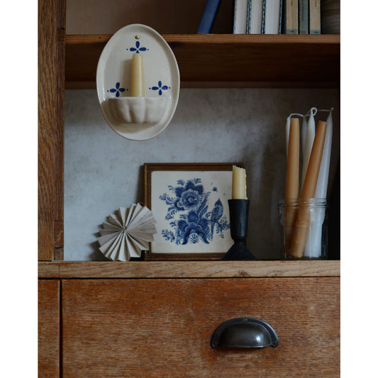 Ceramic candle holders, hand-thrown in Norfolk by Eleanor Torbati. Metal wall sconces, made in Yorkshire. Iron candlesticks, hand-forged in India. Perfectly suited to our hand-dipped beeswax candles.