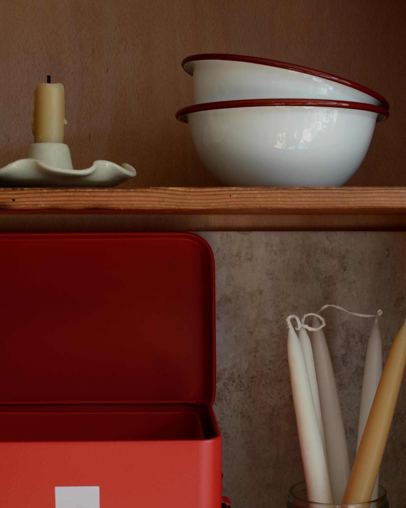 Also shown: Hand-Dipped Beeswax Candles, Frilled Ceramic Candle Holder and Set of 6 Enamel Bowls.