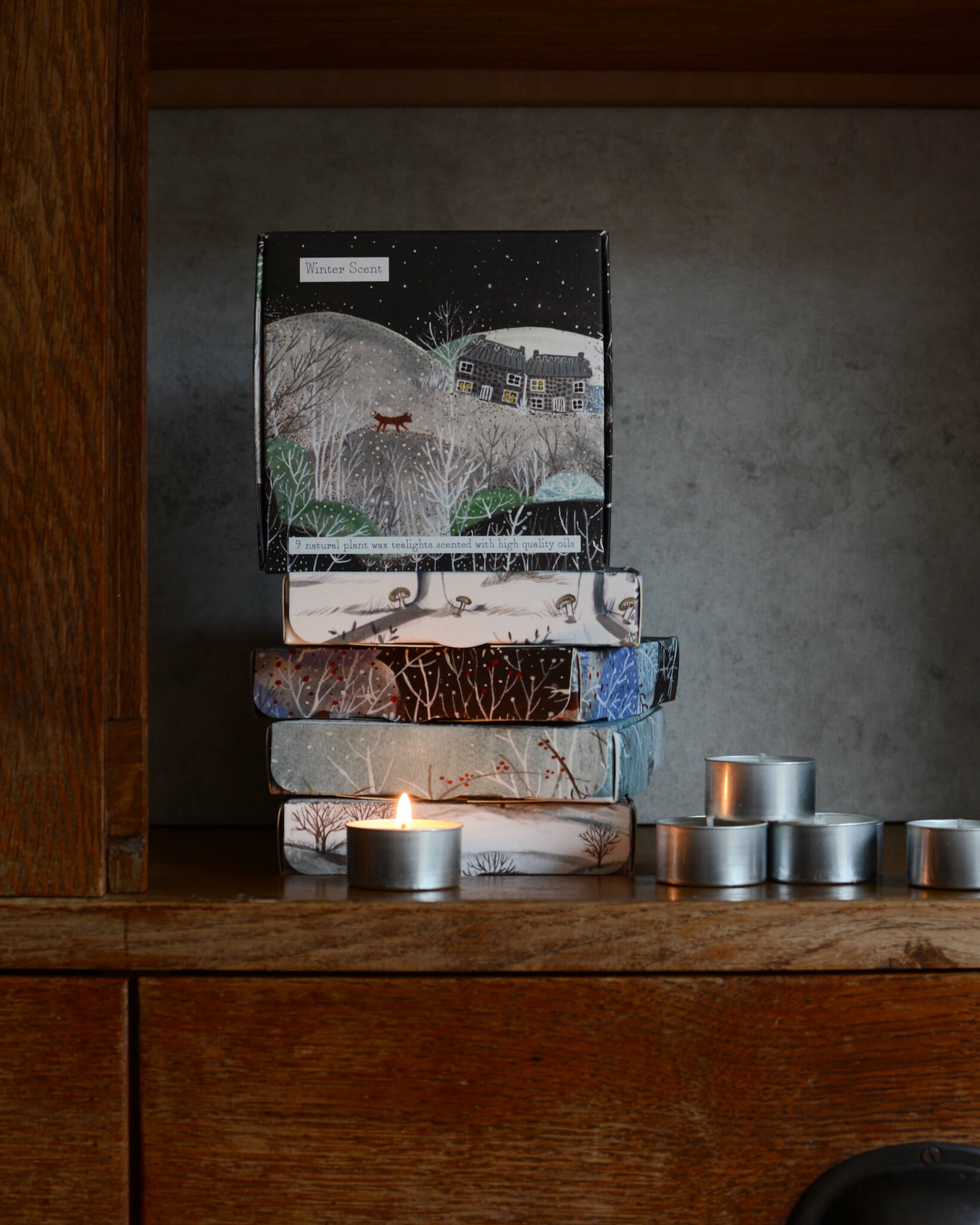 A set of nine winter-scented soy wax tea lights. Charmingly packaged in a beautifully designed box, featuring a fox and sweet cottages in a wintery landscape.